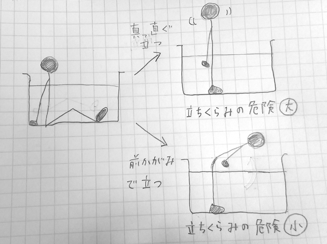 急に真っ直ぐ立とうとすると、血圧の低下(立ちくらみ)の原因になり、意識を失っての溺死や湯船に頭をぶつける危険性を高めます。