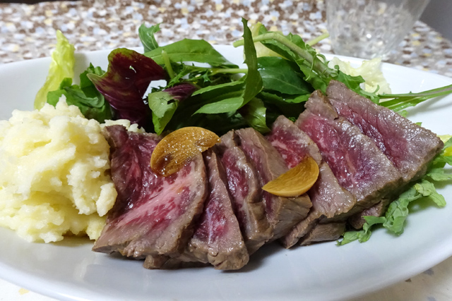 かたまり肉が手に入らない場合は、分厚目のステーキでも美味しく作れます。その場合は調味料を少なめ、加熱時間を「さっと」くらいに。