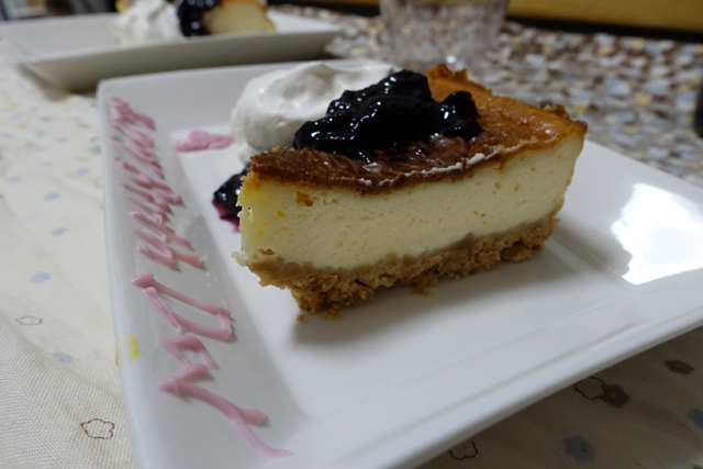 チーズケーキの場合は砂糖を入れても入れなくても仕上がりに差が無く、甘いブルーベリージャムと一緒に食べることを考えて、かなり少なめにしています。無くても良いかも。